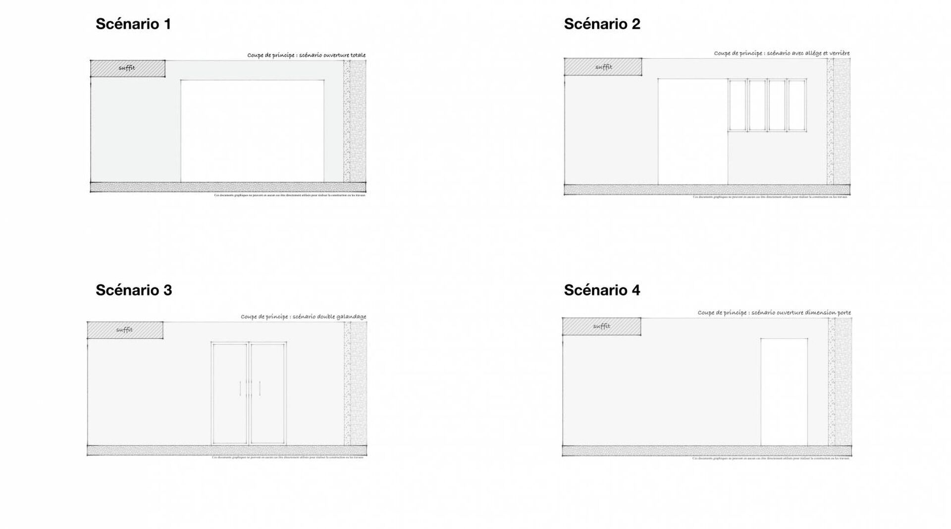 4 scénario sont imaginés dans la réflexion des implantations avec différentes particularités, notamment dans l’aménagement de la pièce de vie, l’intégration de dressing / placard de rangement, la création d’une entrée indépendante et la circulation de la lumière entre les pièces à savoir un scénario avec une une ouverture totale, une ouverture de la dimensions d’une porte, une ouverture avec création allège et possible