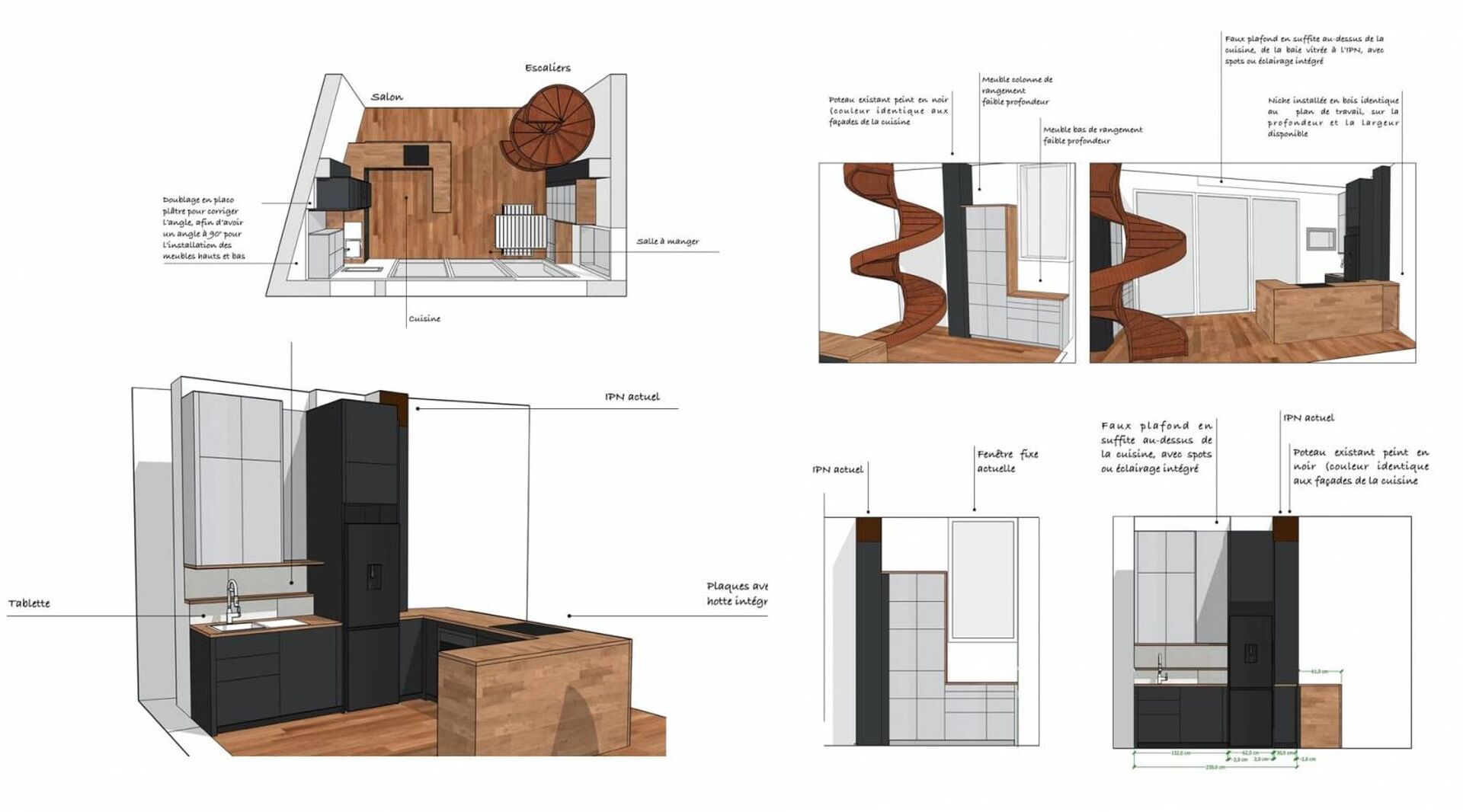 Le propriétaire souhaitait une cuisine ouverte, lumineuse et conviviale, adaptée à une maison familiale issue d'une succession. L’intégration du poteau métallique existant, peint en noir pour s’harmoniser avec les façades mates, et la mise en valeur de l’IPN ont permis d’optimiser les volumes. Le faux plafond avec spots encastrés, conçu par notre architecte d’intérieur à Marseille, assure un éclairage discret et bien réparti.