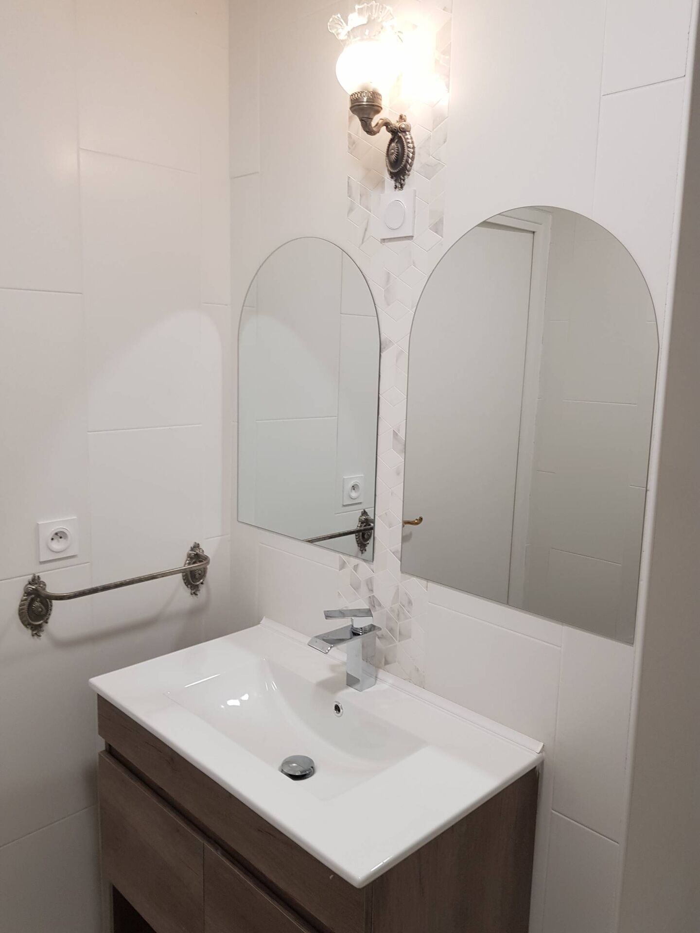 La salle de bain est transformée en un espace plus fonctionnel et esthétique par notre architecte d'intérieur d'Aix-en-Provence. Un WC indépendant est installé accessible depuis le dégagement, tandis que le reste de l'espace est exploité pour l'intégration d'une vasque côté salle de bain. Un bac de douche extra plat est installé dans la salle de bain avec un faux plafond intégrant spots et VMC.