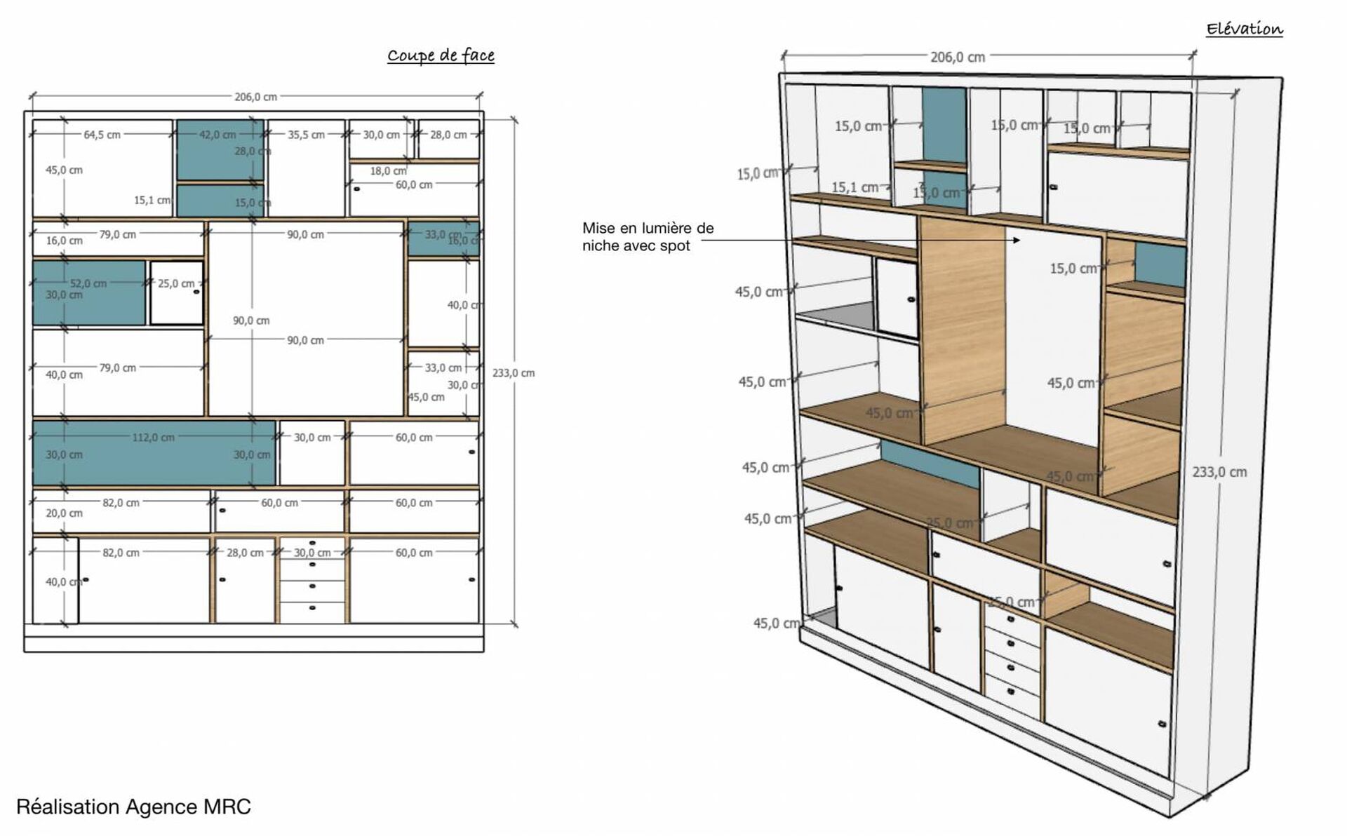 Pour les deux meubles sur mesure réalisé par nos architectes d'intérieur concepteur, création d’un placage de type plâtrerie, collé sur support qui est préalablement préparé, afin de dissimuler les réseaux électriques, les éclairages et les alimentations. Préparation des supports pour recevoir une peinture blanche et une peinture de couleur pour finition esthétique en fond de niche aménagé.