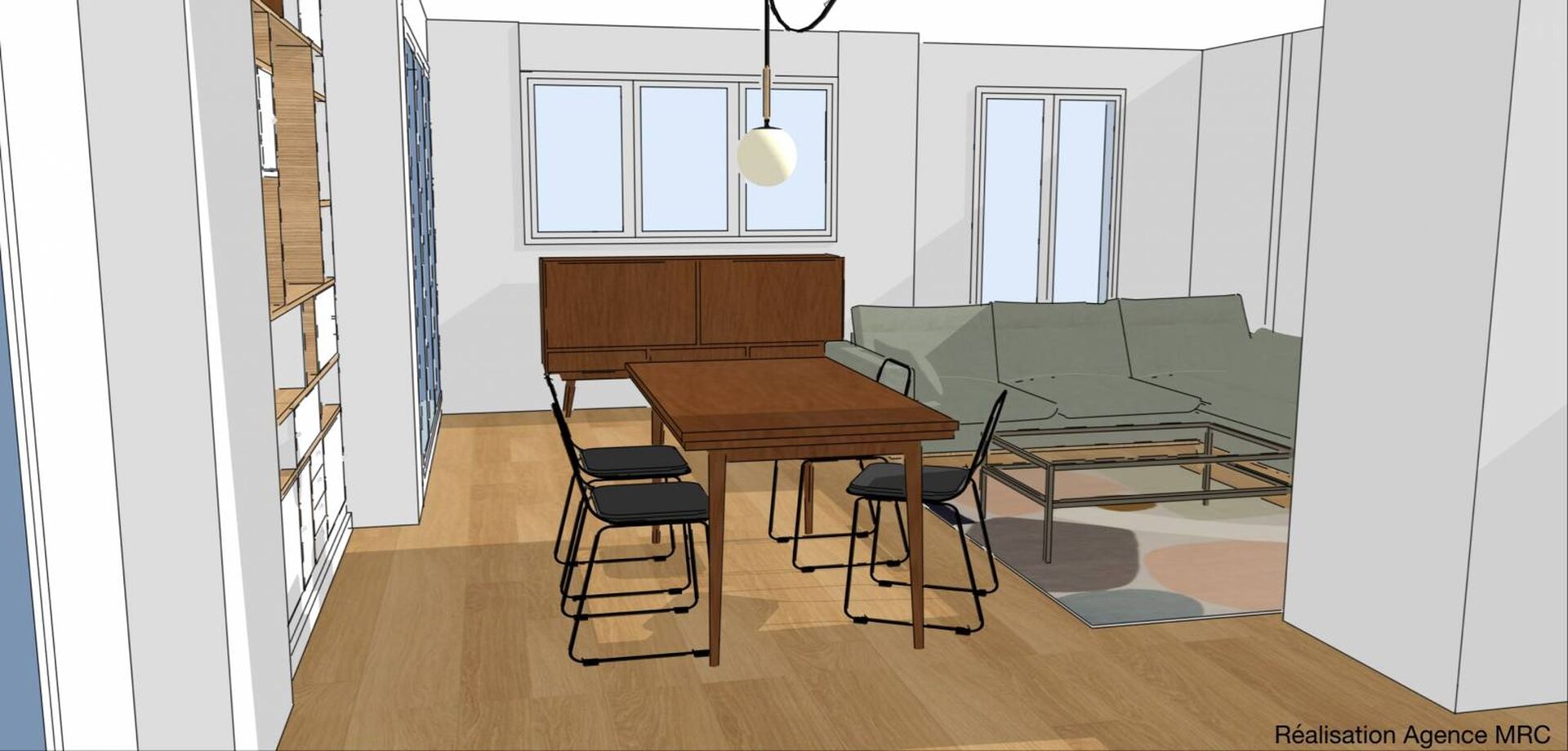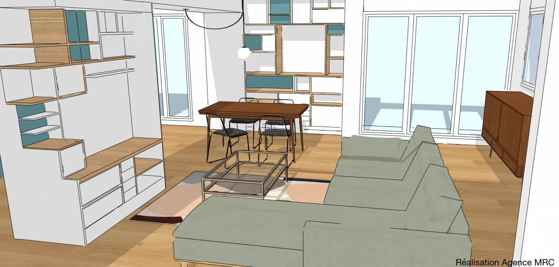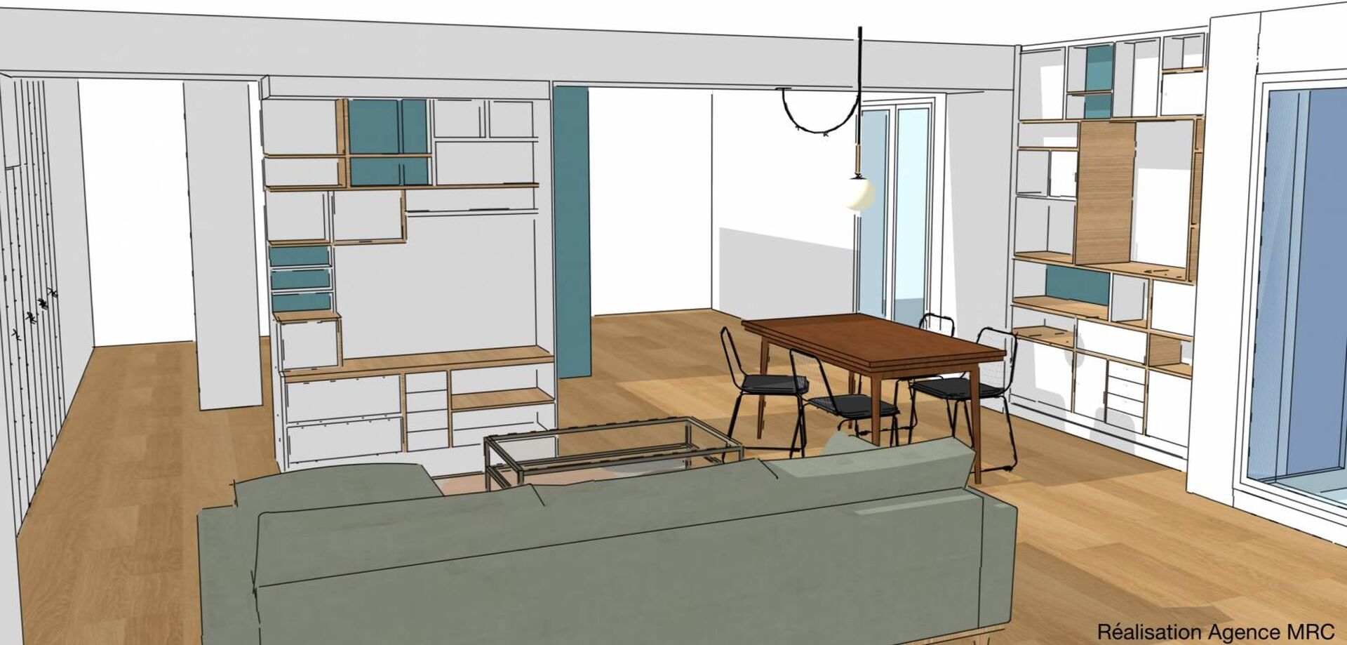 Mise en lumière avec interrupteur pour chaque meuble sous la forme des spots intégrés. Avec deux réseaux avec interrupteur et télécommande pour chaque meuble. Modification pour un des spots intégrés dans le coffrage de la poutre du salon pour l' installation d’une suspension au-dessus de la table de la salle à manger dans un esprit tombant pour mise en valeur de l’espace repas.
