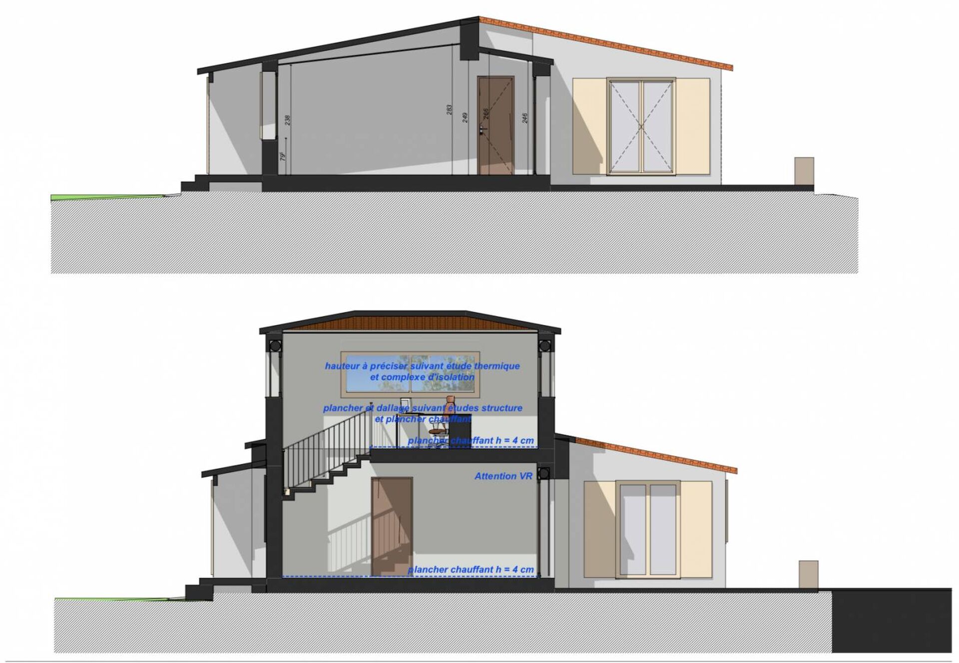 construction à usage d’habitation, élevée d’un simple rez de chaussée sur cave partielle, est existante sur le site d’implantation. C’est cette construction qui est la base du projet proposé à l’instruction dans le