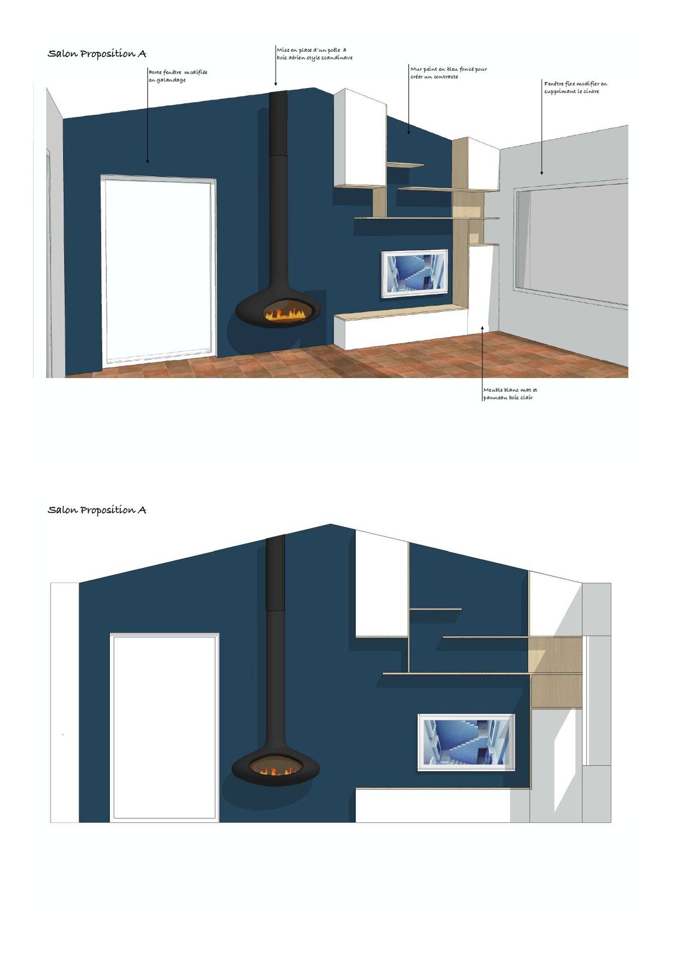 - Le poêle moderne est conçu pour être le point focal du meuble, flanqué d'étagères flottantes et d'une niche TV pour un aménagement optimal.
