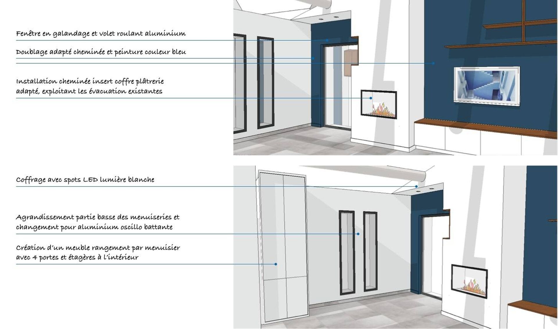 Dans chaque projet conduit en qualité d'architecte d'intérieur à Aix-en-Provence, vise à moderniser et améliorer les espaces en mettant l'accent sur la lumière naturelle, l’harmonie des matériaux et l'efficacité énergétique, notamment à travers l'utilisation judicieuse de matériaux de qualité et de techniques. Ce souci du détail se traduit par des aménagements aussi bien esthétiques que pratique, créant des environnements contemporains et chaleureux. Par exemple, l'intégration de meubles de rangement conçus sur mesure, l'installation d'étagères murales et de niches décoratives en bois, ou encore l'adoption de solutions d'éclairage innovantes comme la télévision connectée "FRAME", contribuent à enrichir l'esthétique de l'espace tout en maximisant son utilité, comme dans le cadre de ce projet en avant-projet sur Aix-en-Provence.