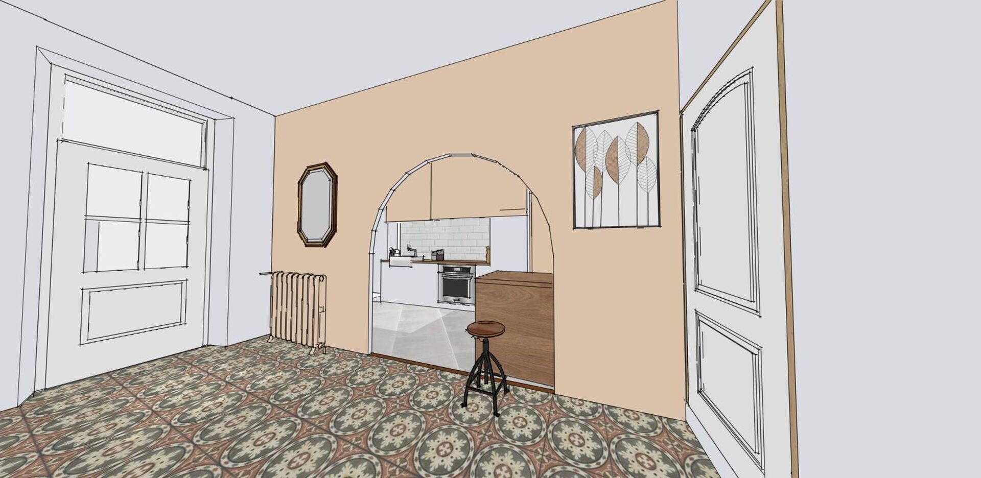 - Refaire intégralement la cuisine en gardant l’idée du linéaire pour tous les éléments fonctionnels (évier, cuisinière et four au gaz, hotte, lave-vaisselle, plan de travail, placards), avec ajoute d’espaces de rangement,