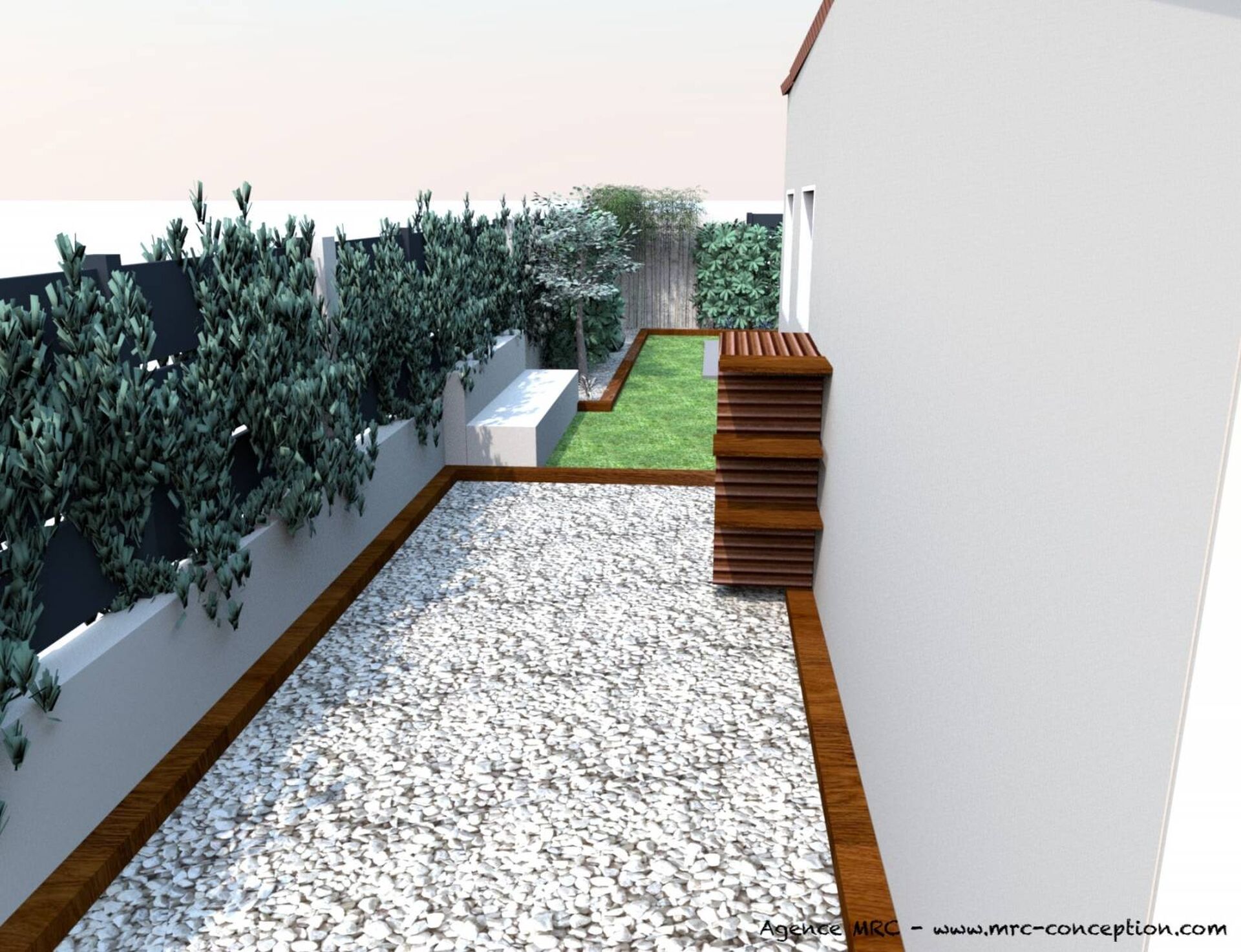 Des traverses de bois sont intégrées pour délimiter les espaces où les végétaux sont présents, notamment proche de la haie. Le nouveau cheminement proche de la maison est créé ; ce chemin s’amorce par un grand banc maçonné, entre le nouveau boulodrome et l’espace piscine.