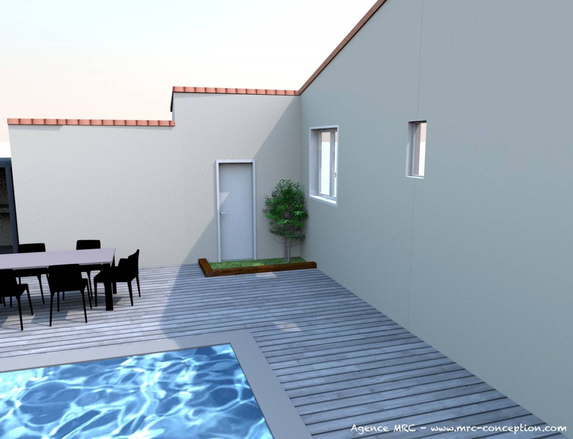 La Création d’un nouvel espace est définie à l’arrière de la maison, dans l'univers d’inspiration identique à l’avant de la propriété, c'est à dire contrasté et contemporain. Une terrasse en composite grisée, avec une pelouse synthétique sont installées, ainsi qu’une piscine de 15m2 et construite à l’arrière de la maison.
