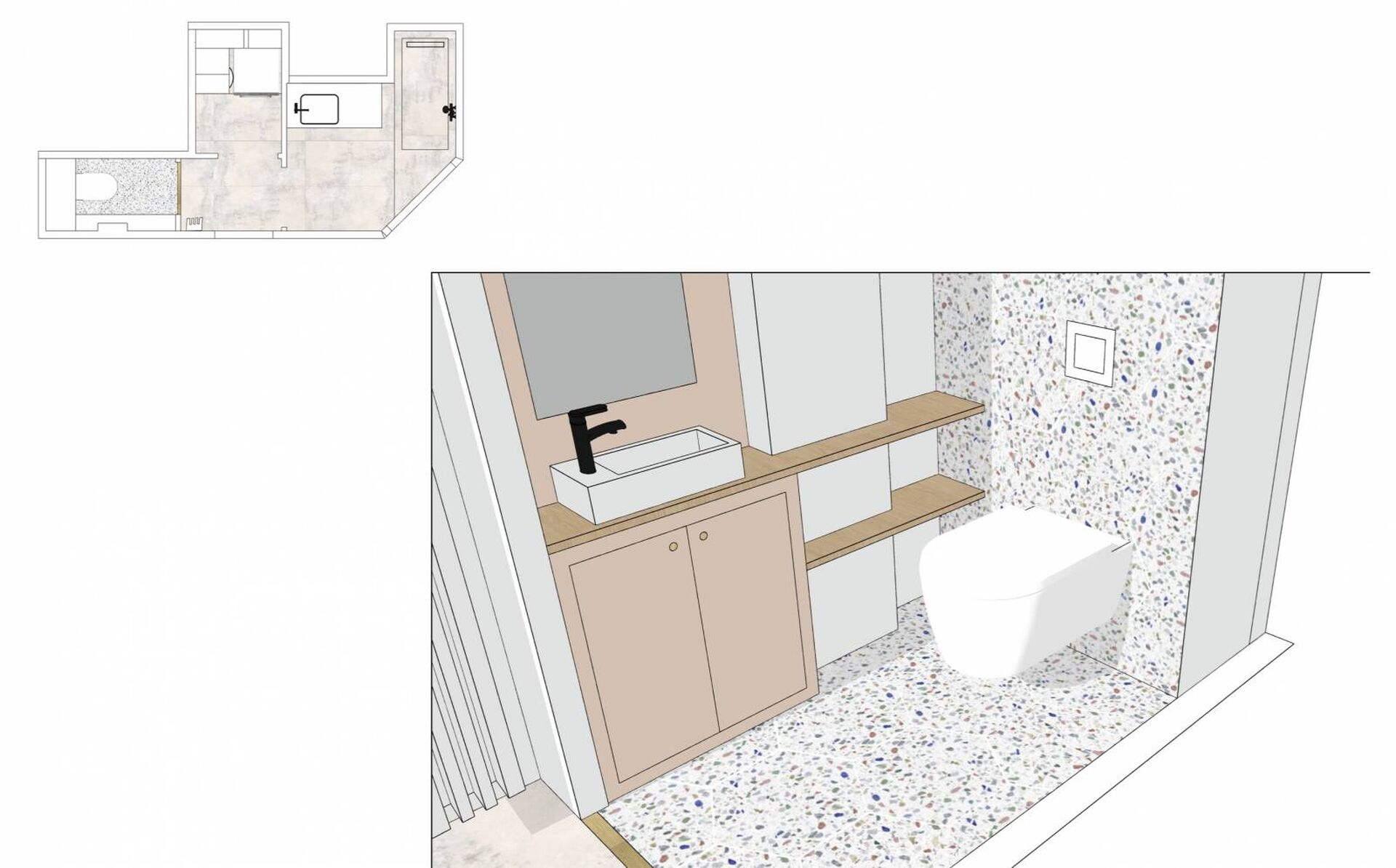 - Une petite vasque et qui maximise l'utilisation de la pièce sans sacrifier la fonctionnalité, tandis que le revêtement mural en terrazzo ajoute une touche esthétique durable. à savoir