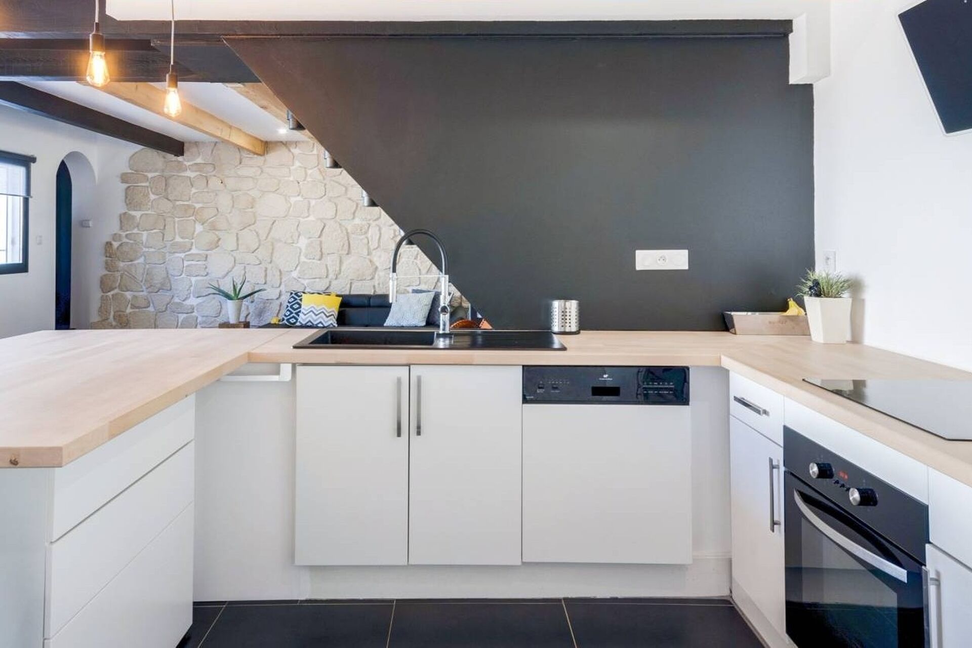 Le plan de travail a été changé en bois massif en hêtre, avec une composition et forme sur-mesure, pour lier l'espace de la cuisine en totalité avec le reste du salon et des espaces de vie. Ainsi, cet espace intérieur qu'est la cuisine, se trouve être au centre de cette maison à Marseille. Un projet de rénovation de cuisine, salon ou d'une maison ? Contactez l'agence MRC, nous travaillons dans toutes les Bouches-du-Rhône. Nous pourrons convenir d'une rencontre pour discuter autour de votre projet de rénovation intérieur.